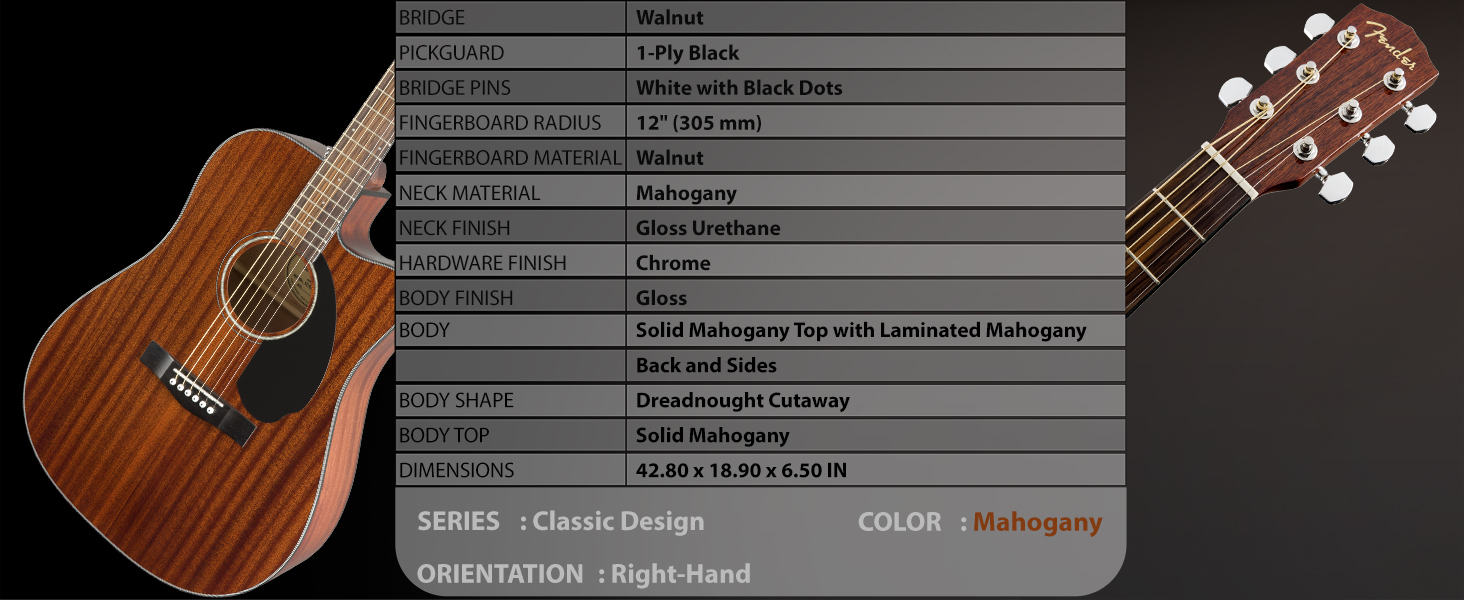 Brand Fender Top Material Type Mahogany Wood, Spruce Wood Body Material Mahogany Back Material Type Mahogany Wood Neck Material Type Mahogany Fretboard Material Type Mahogany Wood Guitar Pickup Configuration Piezo String Material Type Phosphor Bronz