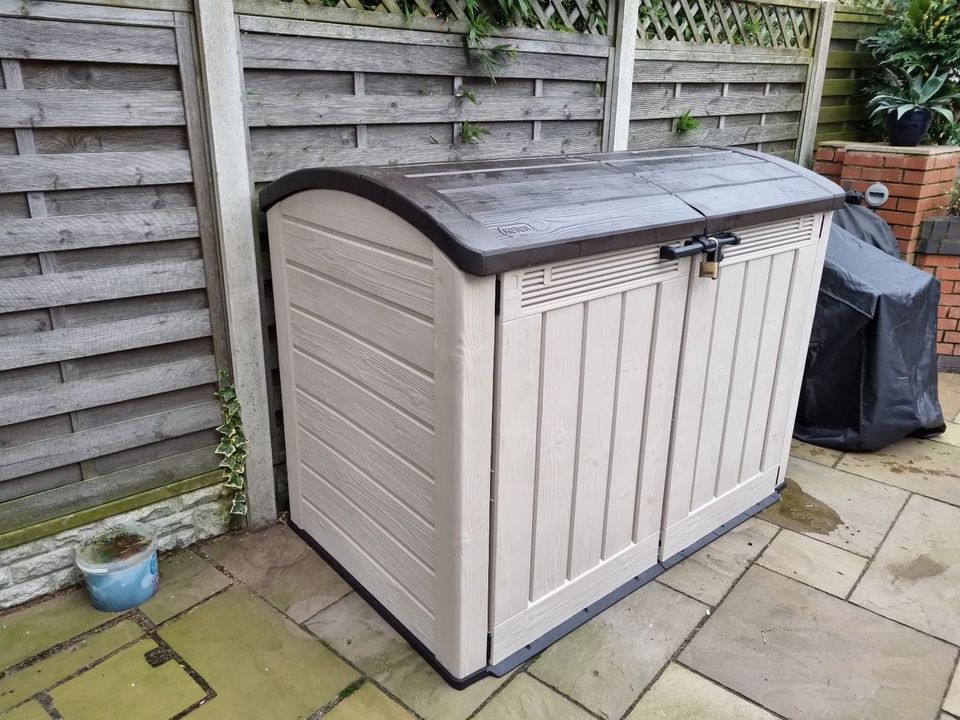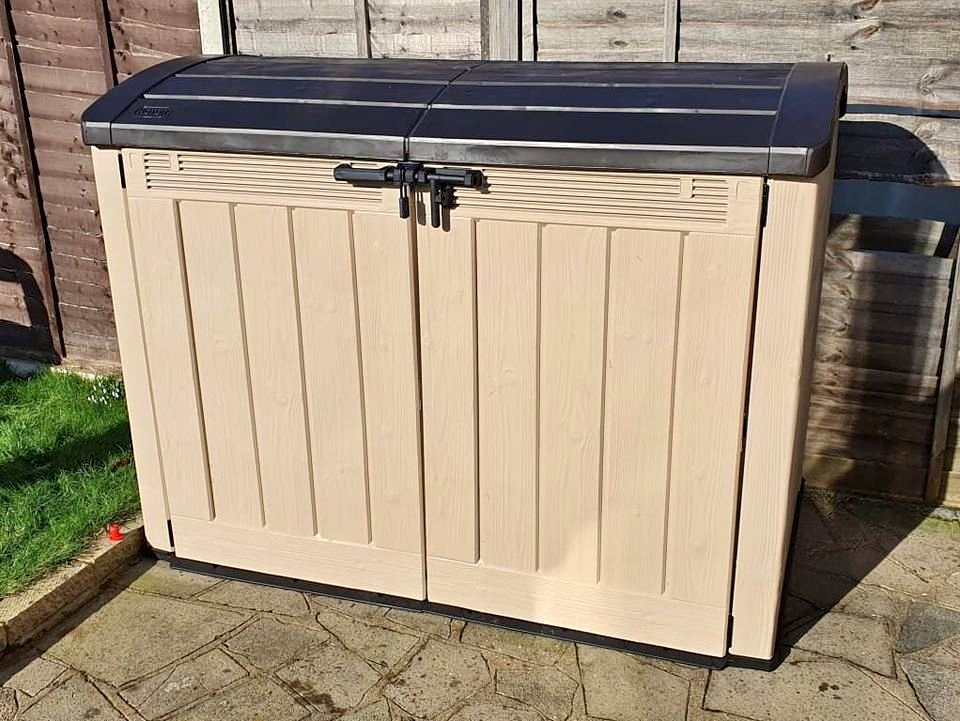 • Ideal outdoor storage solution for garden tools and equipment, BBQ and accessories, bicycles and x2 360 Litre or three 120 Litre wheelie bins