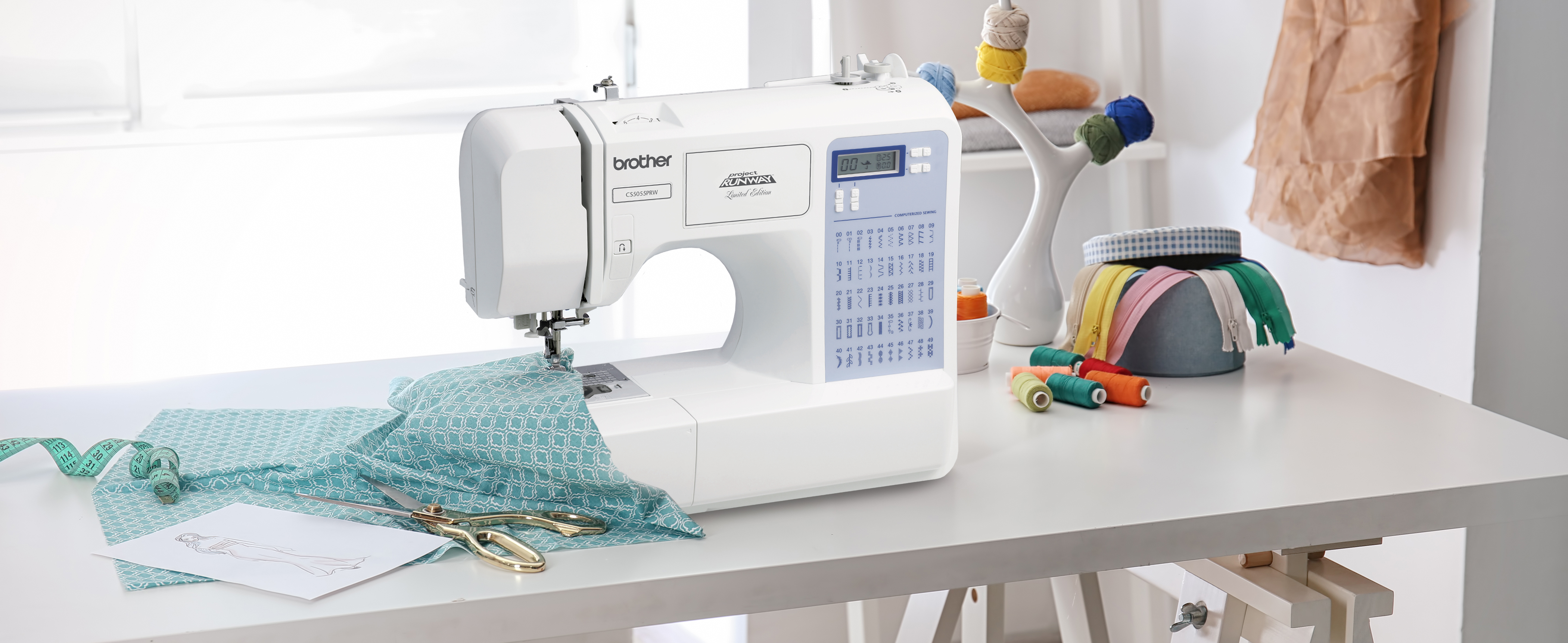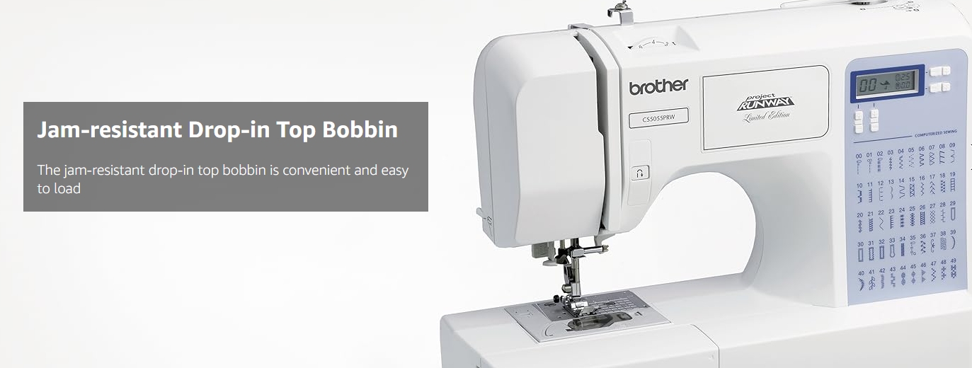 Create high-end fashions at an affordable price, with this incredibly easy to learn and use, exclusive Brother Project Runway computerized sewing machine. The CS5055PRW offers complete couture-level solutions to help you leverage your sense of style into one-of-a-kind, runway-ready fashions. Experience easy, reliable threading of both top and bottom threads; virtually effortless sewing on a wide range of fabrics, and the ability to add professional quality buttonholes, zippers, decorative top stitching and neat, overcasting edges to your favorite creations. The CS5055PRW includes 50 built-in stitches that cover a wide range of utility, decorative, heirloom and quilting stitch functions, and your entire selection of built-in stitches is printed on the front your machine, for easy reference. Simply select your desired stitch on the informative LCD display screen and adjust the stitch to your specific needs. And for truly custom results, choose from the 5 one step buttonhole styles that are actually custom-sized to fit your specific buttons. Includes 6 specialty sewing feet, complete bilingual English and Spanish instruction manual, and a 25-year limited warranty. ;.